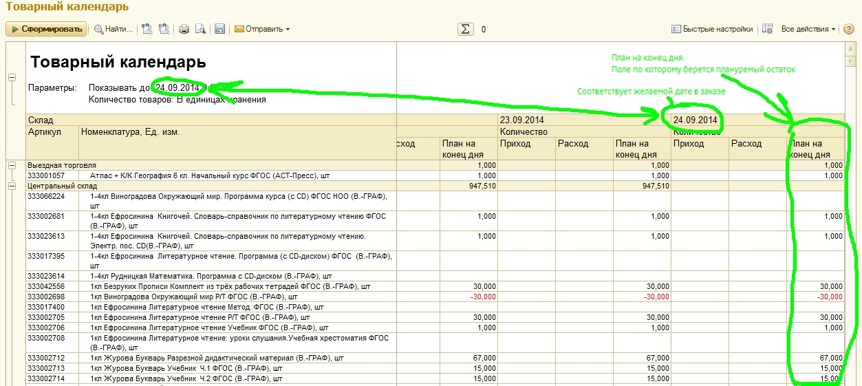 По аналогии с отчетом "Товарный календарь" получаем планируемый остаток номенклатуры ("План на конец дня" или "Конечный остаток").