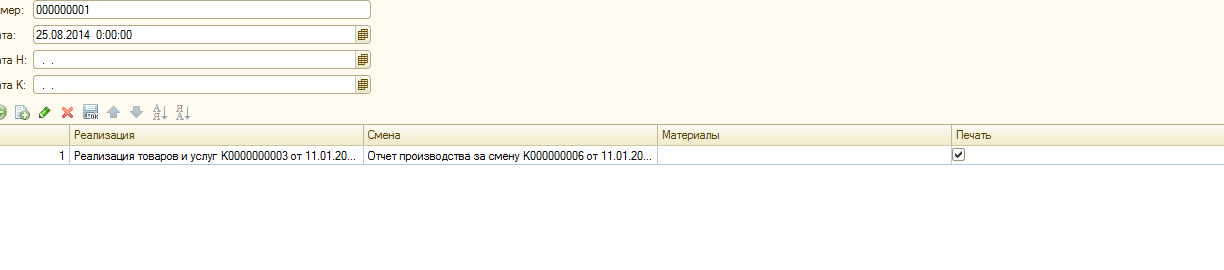 В табличную часть попадают все реализации продукции (кор кредит сч. 43) и к каждой автоматически подбирается отчет производства за смену. Есть колонка Материалы и есть колонка печать. В колонку ставится флажок (галочка) если есть списание материалов в отчет производства за смену. Возможность установка галочек печать от условий.