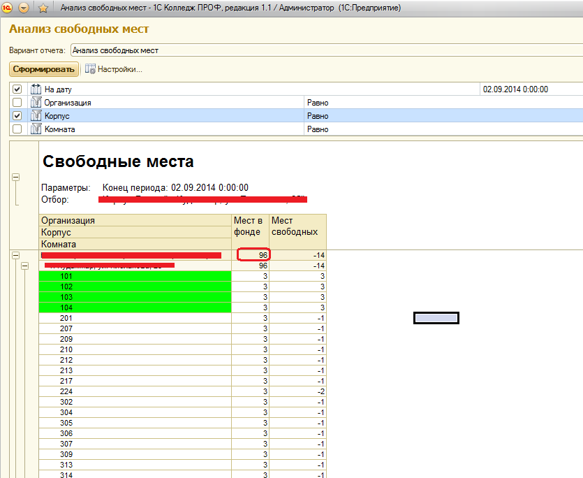 В отчете не выводятся строки с нулевым результатом, из за этого считается не верно колонка "Кол-во мест в фонде". Т.е. не выводятся комнаты в которых заняты все места (остаток 0) Конфигурация 1С:Колледж.