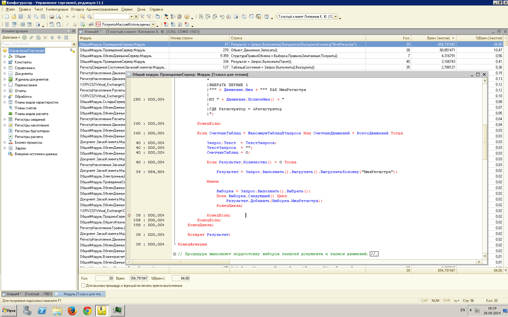 Но с процессом подготовки возникают проблемы. Он ОЧЕНЬ ДОЛГО выполняется. Где-то по 18-20 секунд на один заказ. Загрузка процессора при этом 0%. Судя по счетчику производительности все это время потребляет типовой модуль "ПроведениеСервер" (см. приложенный скриншот).