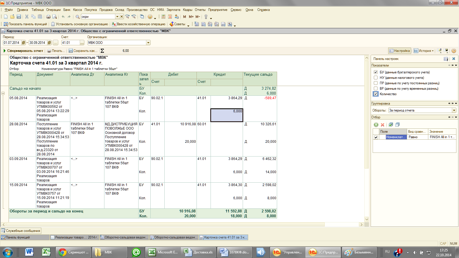 месяца числилось 6 шт по 3 274,82 руб., а при реализации списывается по 3 864, 29 руб. ( т.е. 3 274,82+НДС 18%) и так по всей номенклатуре 41 счета.