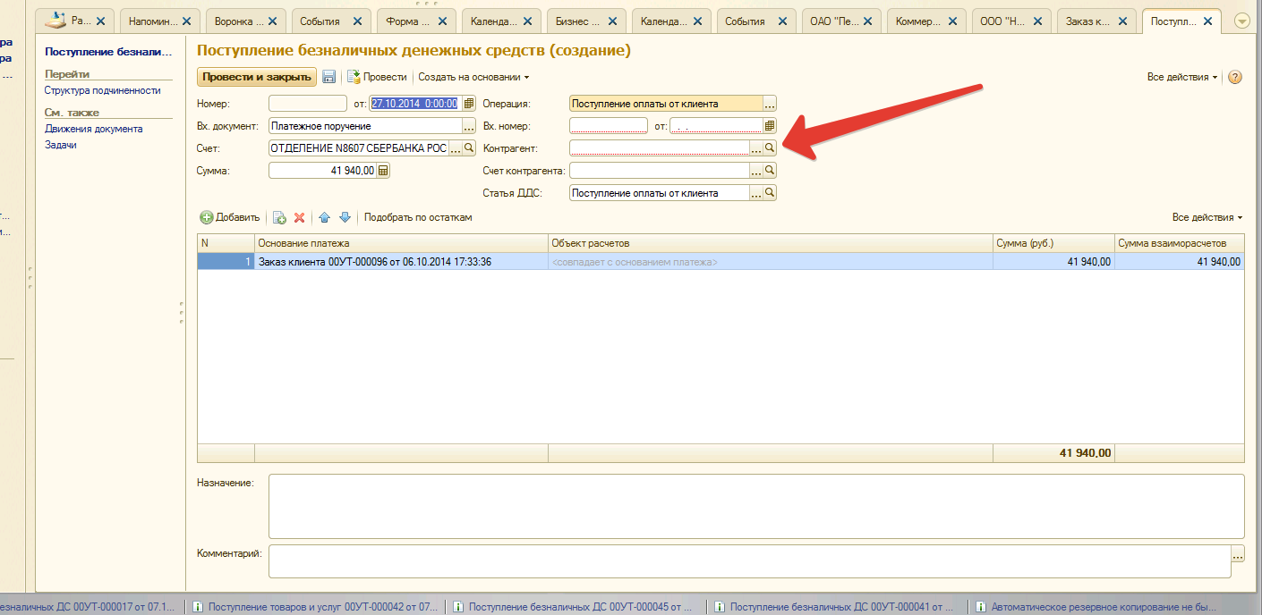 Если создаем на основании заказа клиента поступление ДС - в создаваемом документе не заполняется контрагент.