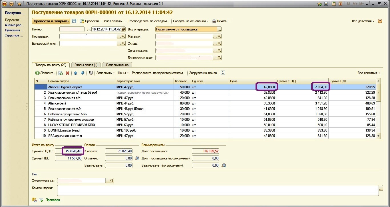 1. В Документе поступление товаров нам нужно что в колонках (Сумма с НДС, Цена) было 4 знака после запетой, и чтобы при вводе эти копейки пересчитывались в соседней колонке. Также внизу в колонке "Итого по факту" в позиции также чтобы выходило с 4 знаками после запятой и чтобы посчитанное значение выходило. (На рисунке все помечено)