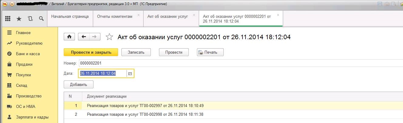 В программе встроен обработчик, который создает акт на основании реализации (меню продажа).