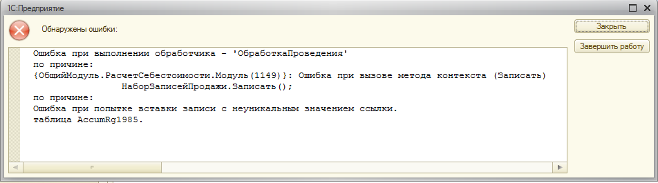 Нужна помощь. "Ошибка при попытке вставки записи с неуникальным значением ссылки. Таблица AccumRg1985"