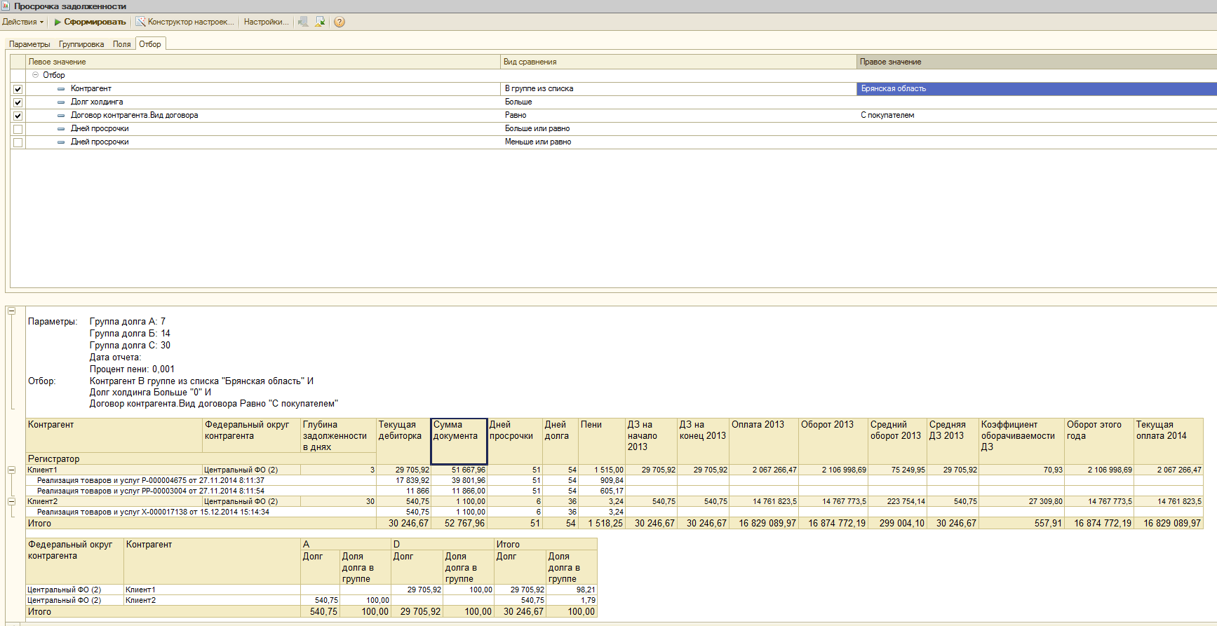 1) Глубина задолженности в днях, текущая дебиторка, пени и т.д.