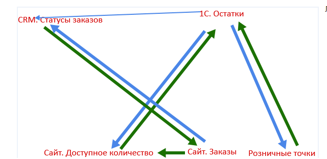 На сайт должно выгружаться общее доступное количество со всех розничных точек и со склада. ( В будущем рассчитываем сделать, чтобы в интернете было распределение количества по каждому складу и роз. точке ).