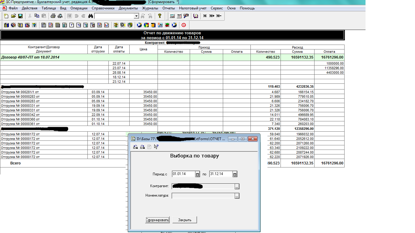 1 отчет. При выборе Контрагента, выводятся Договора и движения номенклатуры по ним. Есть возможность выбора дополнительно Номенклатуры.
