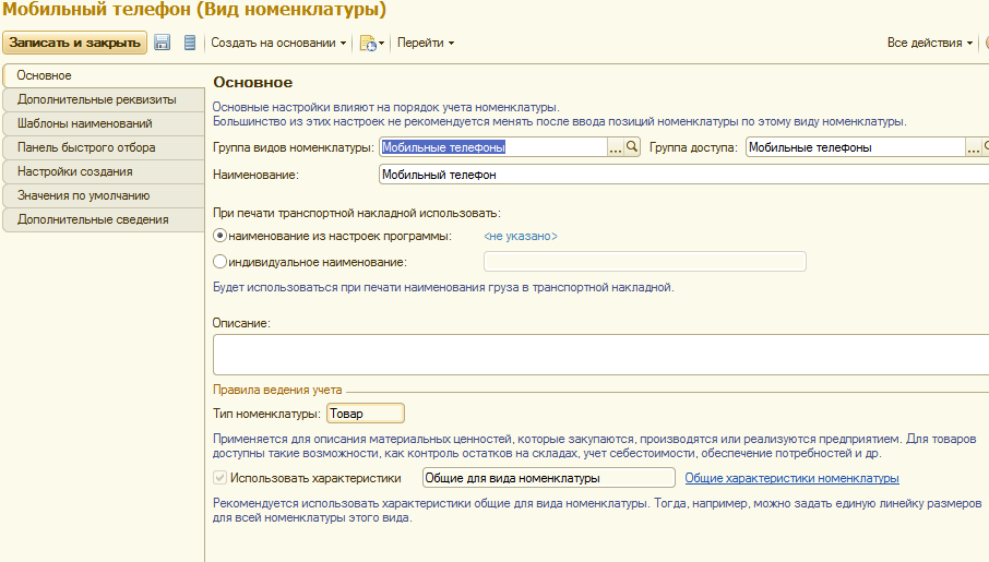 В 1С УТ 11.1 (11.1.9.70) у вида номенклатуры телефон было установлено использование характеристик для "общего", по цветам.