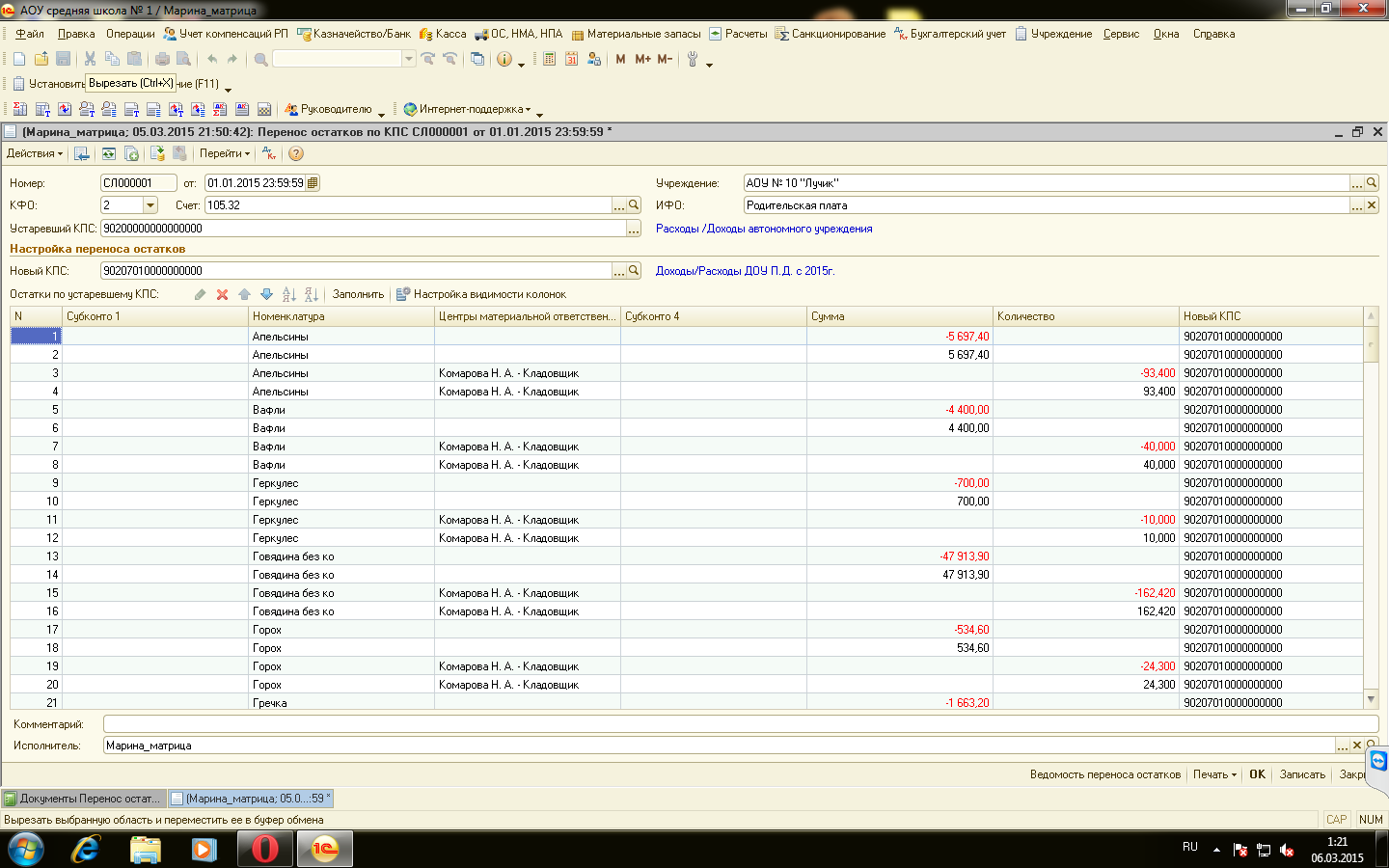 Хотели остатки входящие перенести на другой КПС (на 01.01.15 года) с помощью документов ("Перенос остатков по КПС")