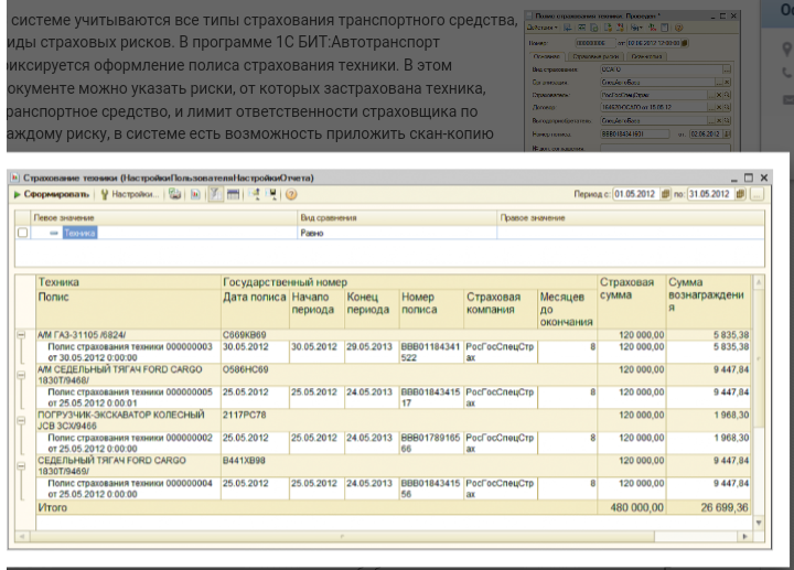 Нужно сделать отчет по страховым полисам с соответствии с конфигурацией. На скрине видно как он должен приблизительно выглядеть. Отчет делается на указанную дату - одну (в отчете период - это неверно!). Соответственно попадают на эту дату все транспортные средства, которые есть. Если есть страховки даты действия которых включают дату отчета, то они выводятся. В страховке в документе есть выбор КАСКО или ОСАГО. Соответственно на печатной форме в одной строке выводится одна и вторая страховки, если они есть. Месяцев до окончания использования тоже надо. Страховой суммы и страховой компании как в отчете на примере у нас нет в конфе, соответственно это не надо. Надо чтобы было:
