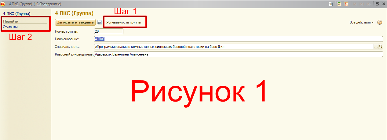 Шаг 1 (Рисунок 1). При открытии справочника Группы и выборе конкретной группы, нажав на кнопку Успеваемость группы должен выводиться список студентов этой группы, дисциплин и оценок за них, как на Рисунке 2.