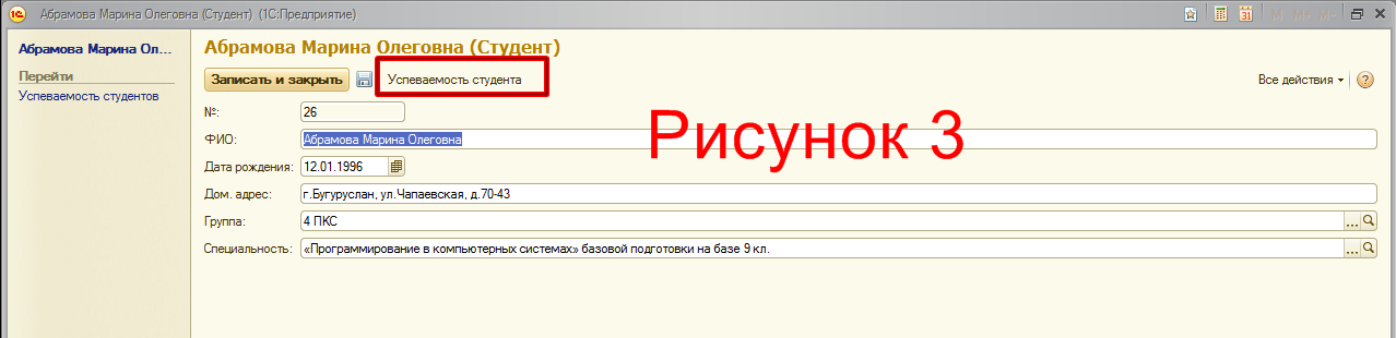 Шаг 2 (Рисунок 1). При нажатии из того же справочника Группы на Перейти->Студенты открывается список студентов этой группы. При нажатии на конкретного студента открывается информация об этом студенте (Рисунок 3). И при нажатии на кнопку Успеваемость студента должен выводиться список дисциплин и оценок этого студента, как на Рисунке 4. Также необходимо сделать, чтобы можно было указывать другой семестр обучения этого студента.