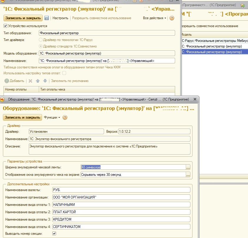 Галочки не нашел, которая устанавливается в 1С: Фискальный регистратор (эмулятор).