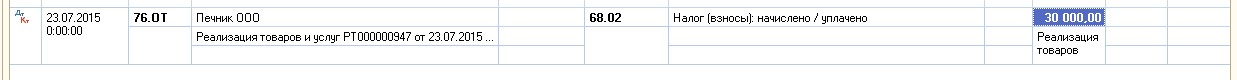 По дебету этого счёта 76.ОТ мы делаем документ РТиУ (с операцией в нём выбранной - Отгрузка без перехода права собственности), получаем 2-рую проводку в этом документе как ДТ 76.ОТ - КТ 68.02 = сумме НДС по доку - в книгу продаж НДС весь целиком встал. (Скрин результат проведения этого дока здесь: Буфер обмена01.jpg, документ 947 от 23.07.2015 года на сумму ндс в 30000 руб.), Здесь всё ОК. Здесь ничего не правим это всё делается как надо. Весь НДС целиком по этому доку в 30000 руб. падает в Книгу Продаж, здесь всё супер, по этому делу править ничего не нужно.