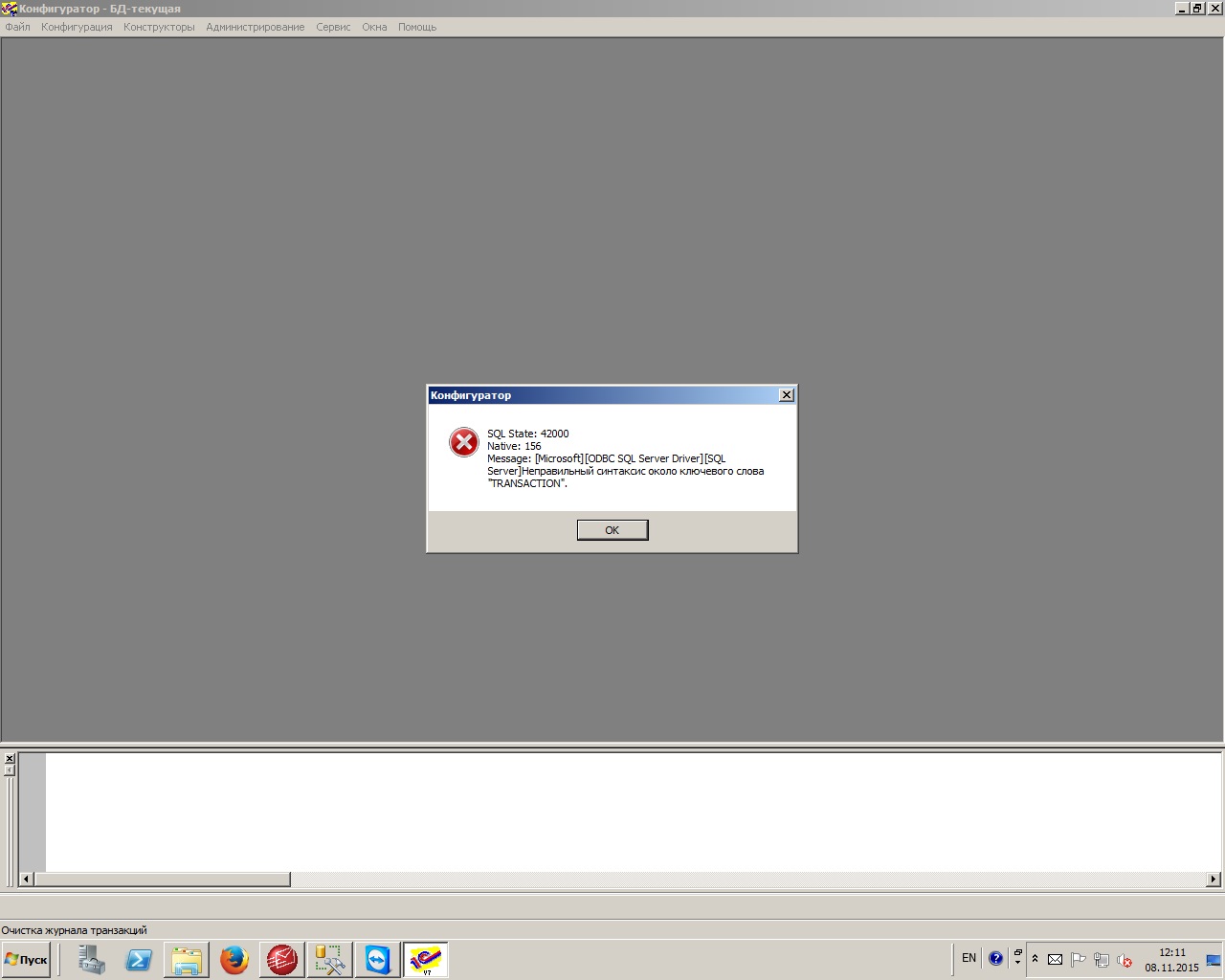 1. Срочно, в течении 2-3 часов требуется исправить ошибку при загрузке базы 1С7.7 из файла на сервер в MS SQL Server Express 10.50.4000 (2008 R2 64bit). Ошибка на сриншоте в прицепе. (SQL State:4200.Native156...Неправильный синтаксис около ключевого слова Transaction)
