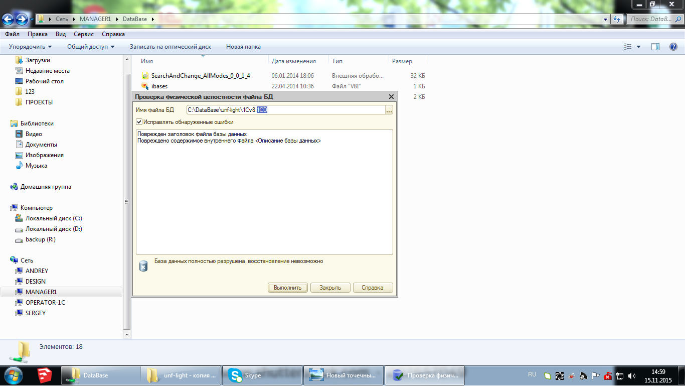 Клиент решил в конфигураторе сделать "тестирование и исправление информационной базы". При тестировании произошла ошибка Windows. В результате программа теперь не запускается ни в режиме 1С:Предприятия, ни в режиме Конфигуратора. Тестирование с помощью ckdbfl.exe не помогает. ckdbfl.exe пишет "База данных полностью разрушена, восстановление невозможно". Актуальной резервной копии нет. Удалось найти работоспособную копию базы четырех месячной давности.