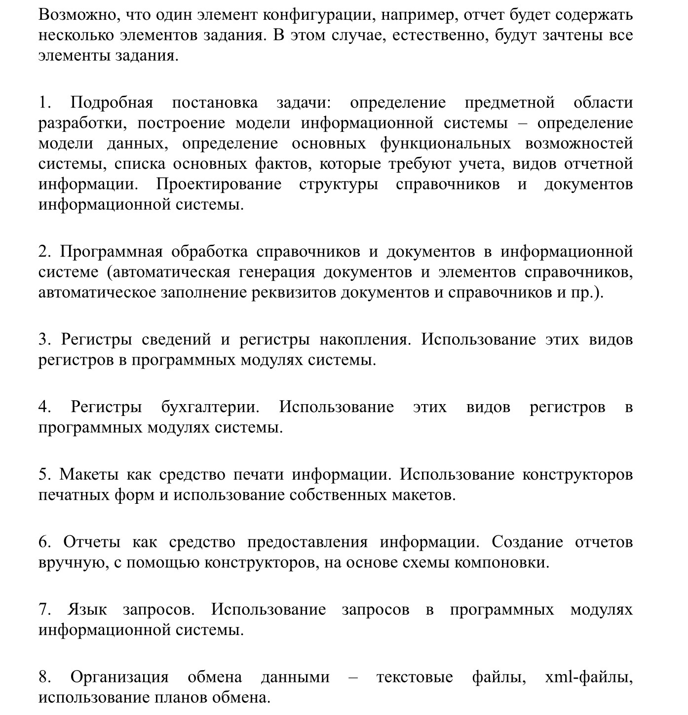 Возможно, что один элемент конфигурации, например, отчет будет содержать несколько элементов задания. В этом случае, естественно, будут зачтены все элементы задания.