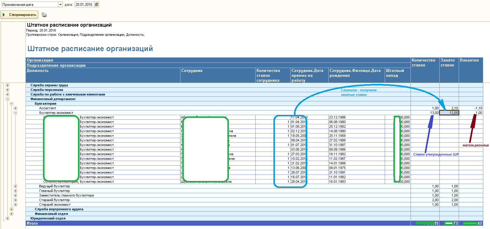 Выводим сколько по ШР утверждено на дату отчета. И показываем разницу. Получается выводим кол-во ставок которые можем еще занять как вакантные или как временно освобожденные кем-то ранее
