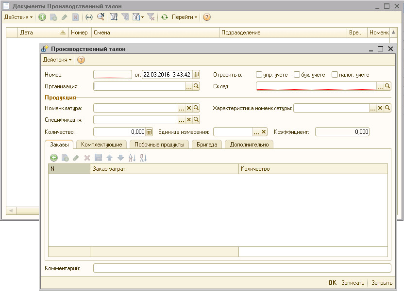 При проведении данного документа должны создаваться / обновляться типовые документы Комплектация изделия, Комплектации побочных продуктов, Перемещения комплектующих, Перемещения побочных продуктов.