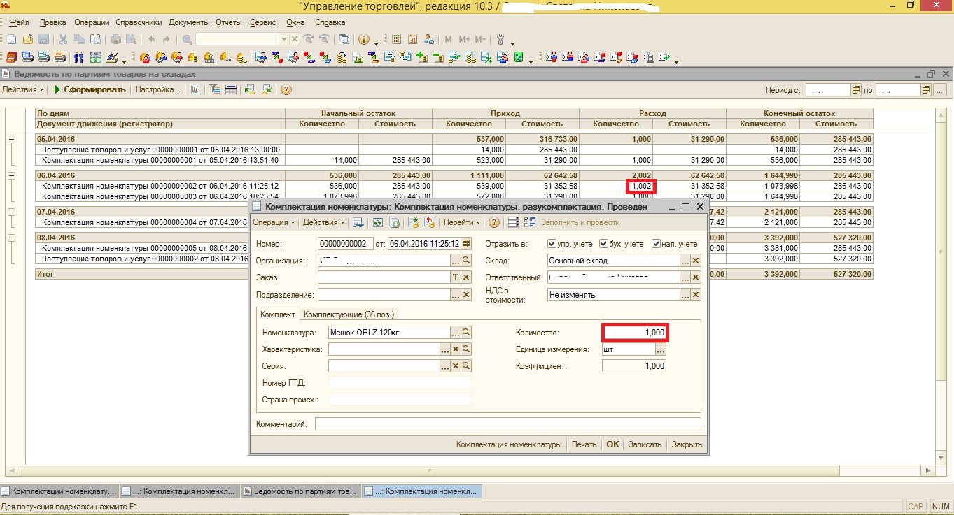 Привет! В некоторых случаях происходит некорректное списание товара при разукомплектации (разукомплектовываем 1 единицу товара, а согласно Ведомости товаров на складах расход составляет 1,002 ед). Требуется доработка, чтобы такого больше не происходило.