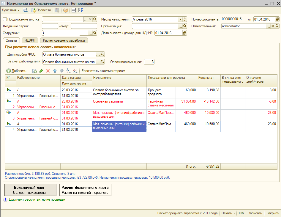 На скриншоте отображена выплата больничных за три дня предыдущего месяца.