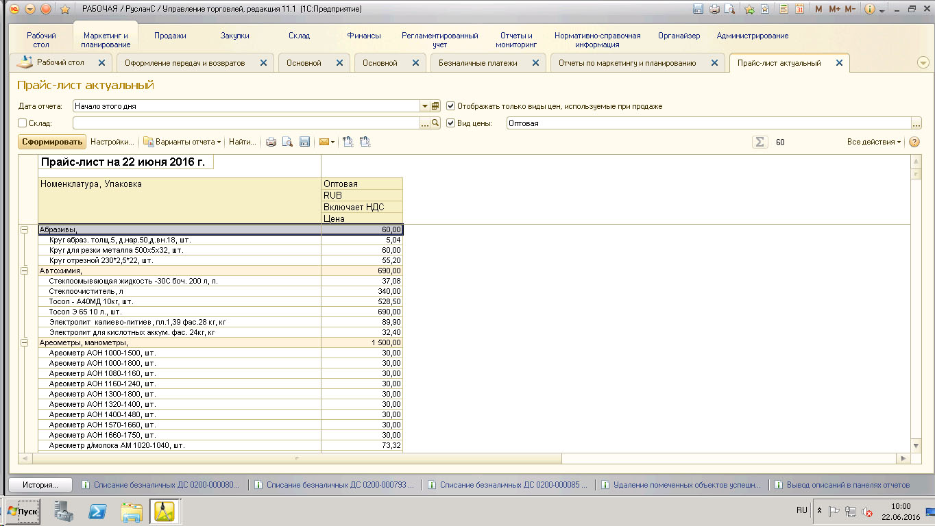 3) В каждой группе номенклатуры (например: Абразивы, 60,00) прописывается значение (стоимость), хотя этого не должно быть. Необходимо убрать.