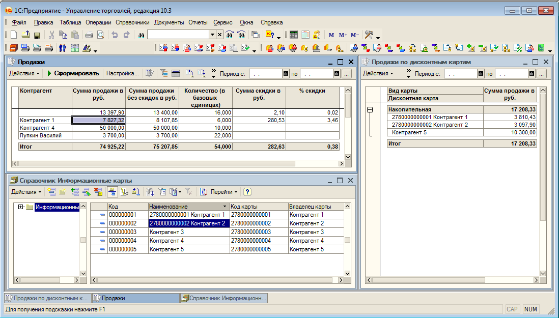Если в справочнике "Информационные карты" у контрагента есть карта, то надо найти сумму продаж по этому контрагенту в отчете "Продажи" (СуммаП) и сравнить её с суммой в отчете "Продажи по дисконтным картам" (СуммаПД).