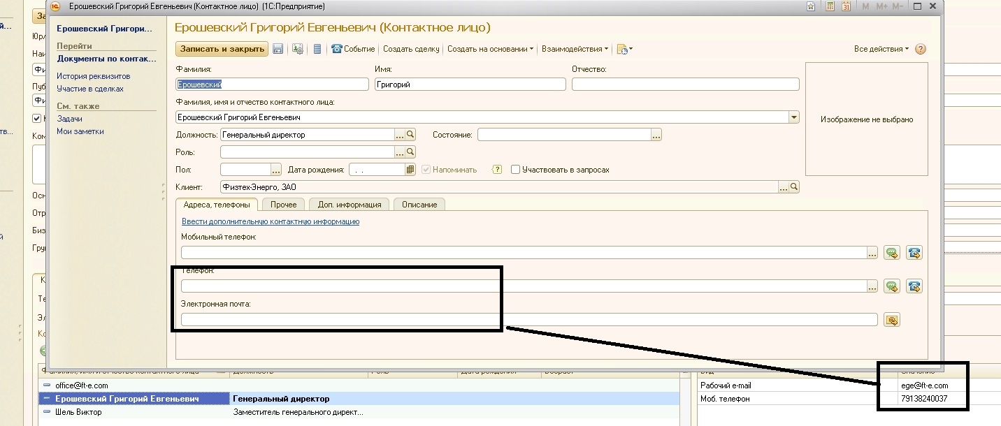 Были залиты клиенты и контактные лица обработкой. Телефоны и мыло записалось, и видны из интерфейса CRM, но при заходе в контактное лицо не видны. Написать обработку перезаписи телефона и мыла. При сохранении карточки, стираются вообще, и также не видны из интерфейса CRM. Через тим отладить и показать.