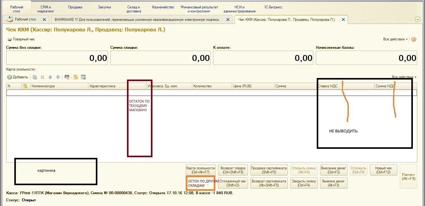 Готов сделать, есть несколько вопросов. Картинка в РМК - картинка последнего товара? По поводу кнопки остатков, по моему логичней добавить колонки с остатками по складам в форму выбора номенклатуры, хотя можно и по кнопке.