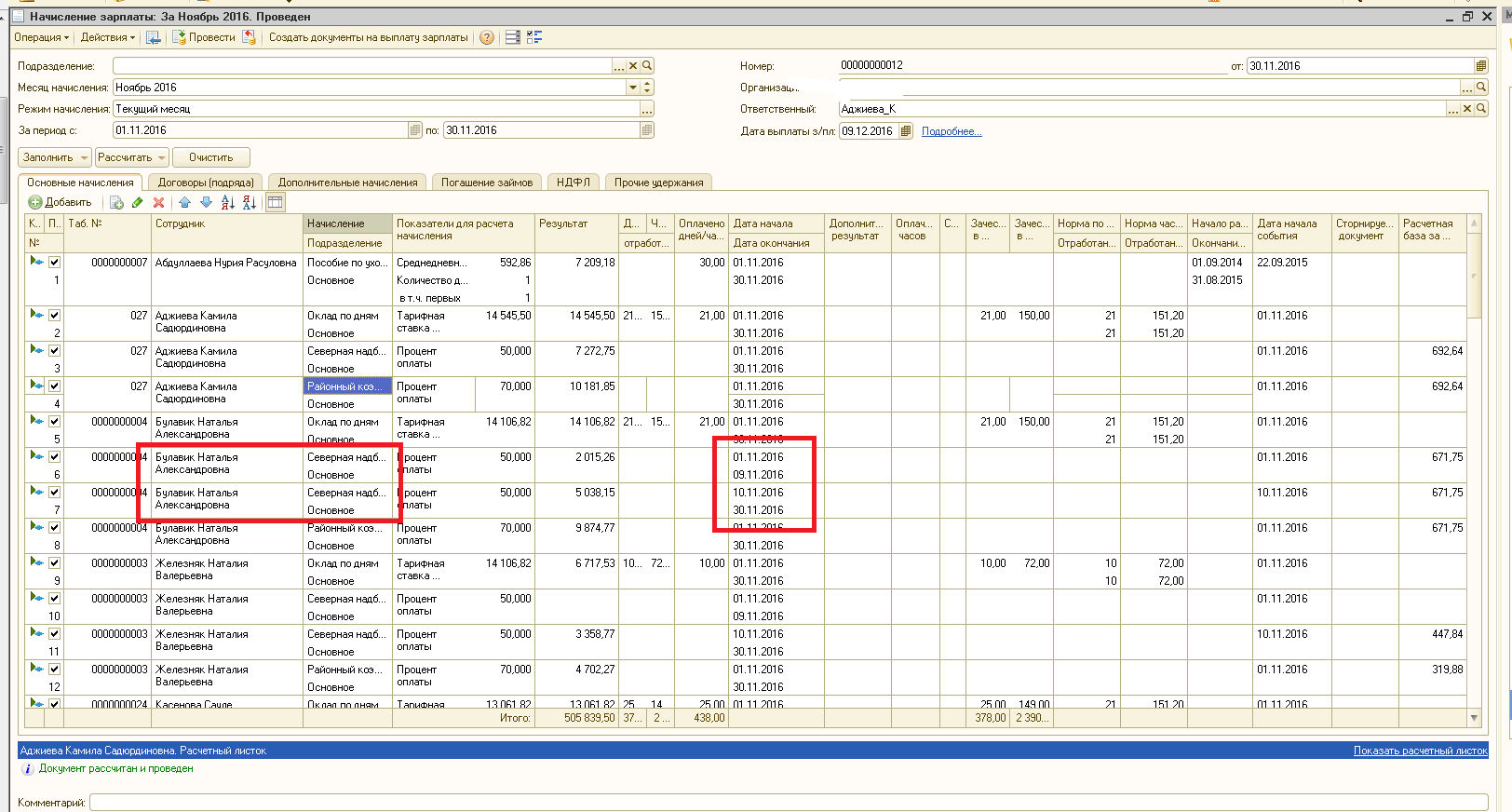 В начислении зп по организации есть раздвоенность по начислению - районный коэффициент. Разделяет на две части суммы. Почему и как исправить?