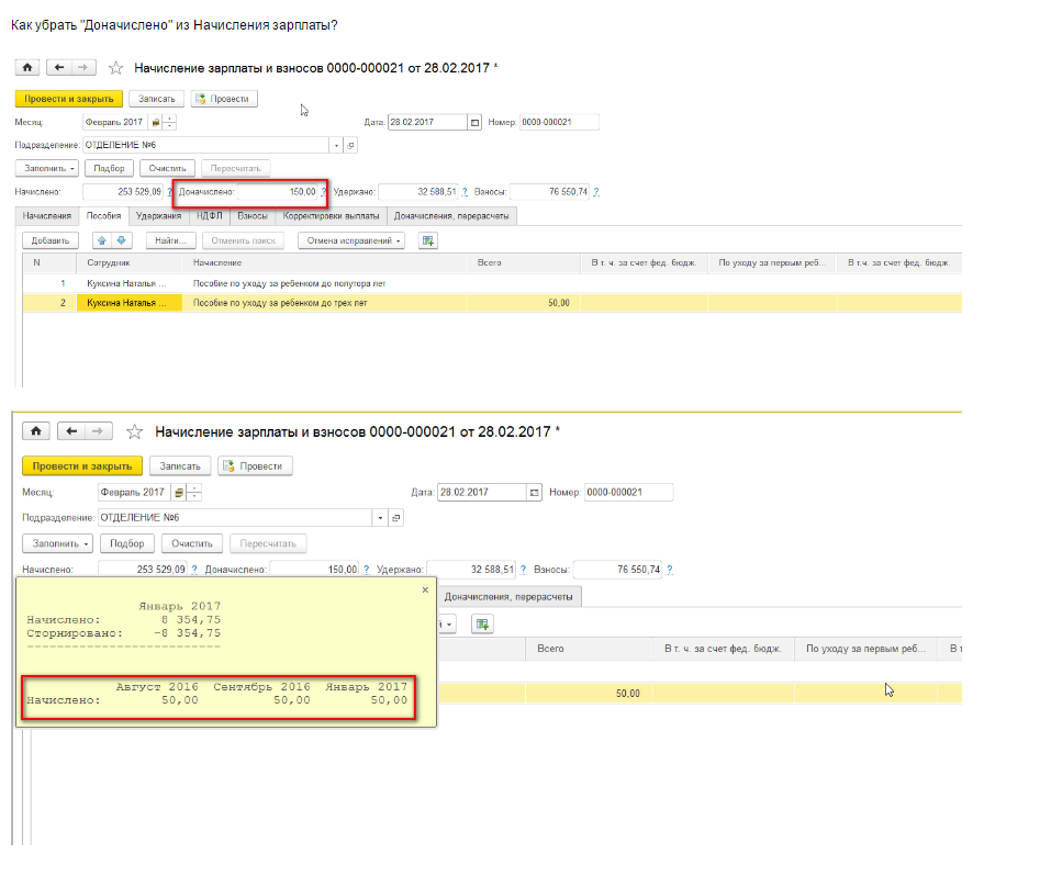 В доначислено при расчете зарплаты кидает суммы, которые уже начислены и выплачены. Необходимо разобраться откуда и как их убрать.