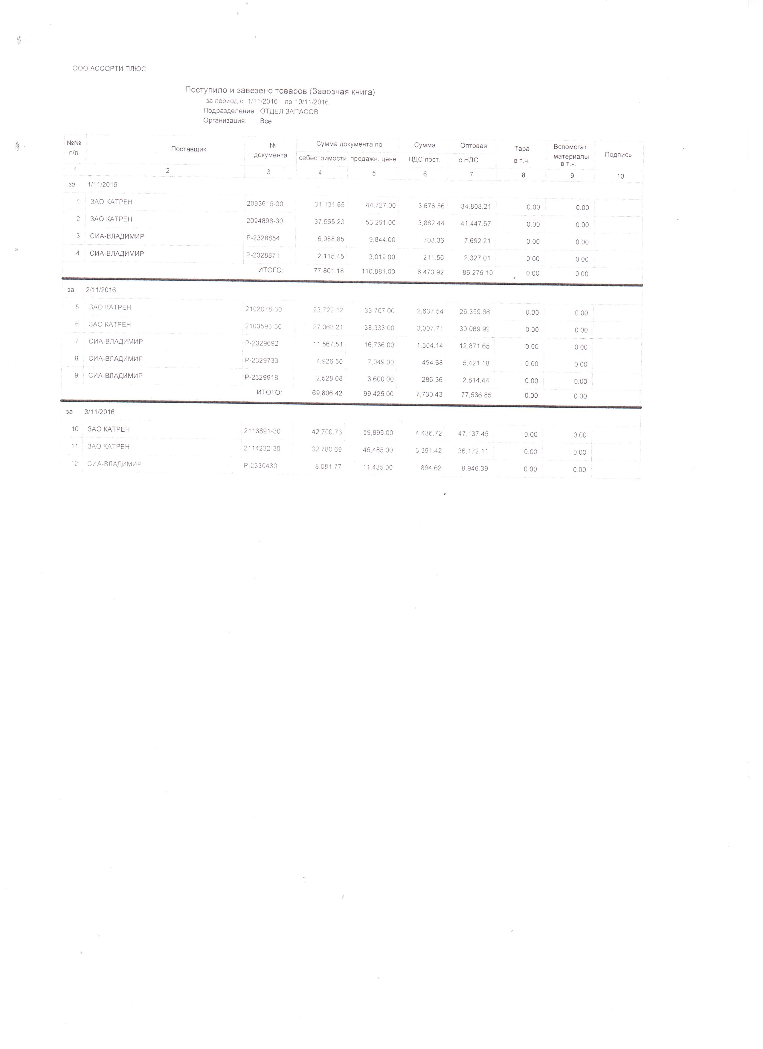 2. Сделать отчет по поступлению от поставщиков (завозная книга) за произвольный период по дням, с итогами за день в приложении... интересует только 1, 2, 3(номер входящего), 5 (док в ценах продажи) и 7 колонки (сумма документа приходная)