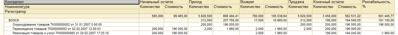 Нужен отчет в разрезах: контрагент, товары, регистратор (опционально) с ресурсами: начальный и конечный остатки, поступление и возврат поставщику, продажа и рентабельность. Все ресурсы в разрезе количество/стоимость
