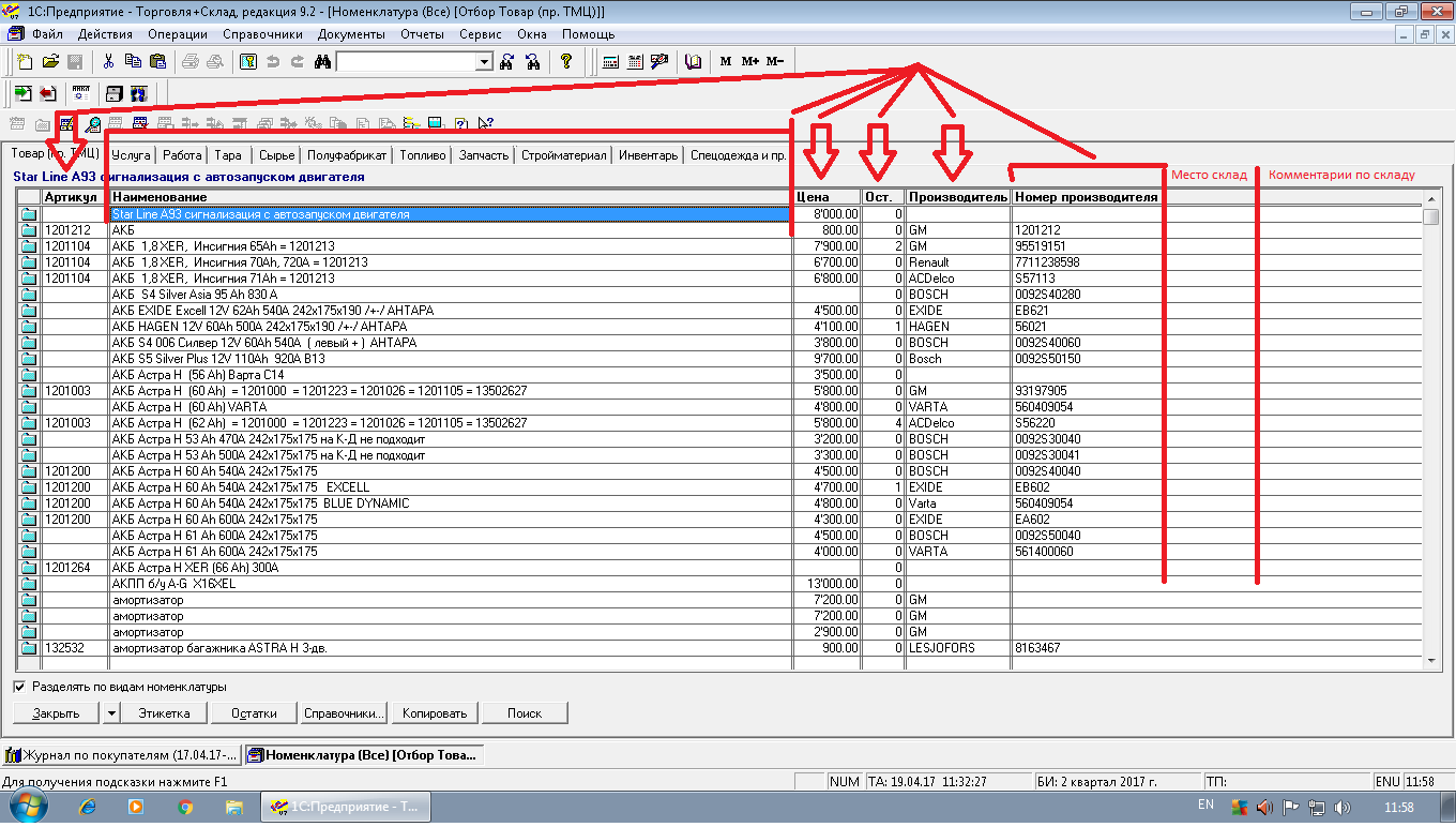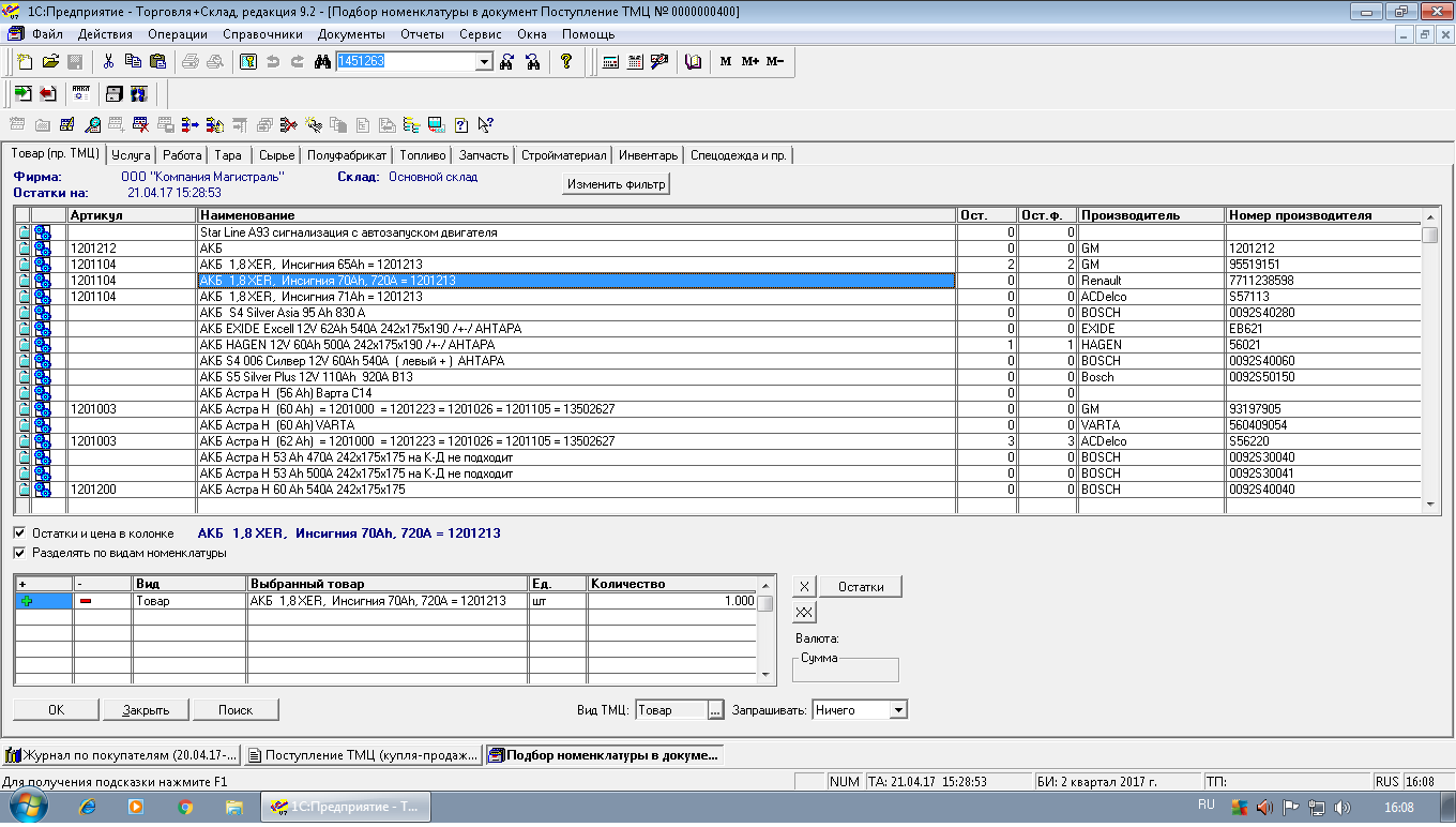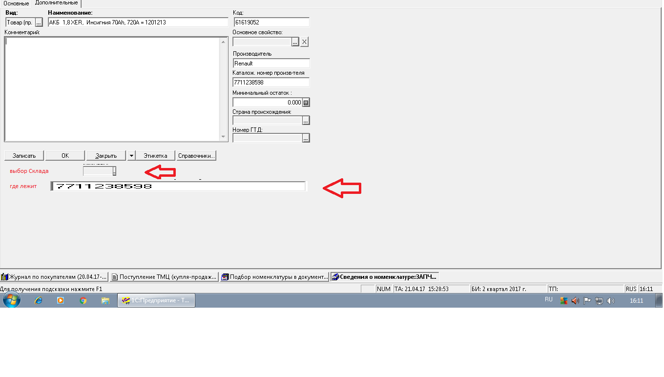 В таблице «Поступление ТМЦ(купля-продажа)» вместо колонок начиная с «ГТД» и до «Свойство»(можно сделать невидимыми) сделать только «Место склад» и «Комментарии по складу» см рис 2. Переходим к подбору номенклатуры (см. рис 3). После колонки номер производителя добавить те же 2 колонки «Место склад» и «Комментарии по складу»,причем по тому же принципу ширины колонок, что и в начале описывал.