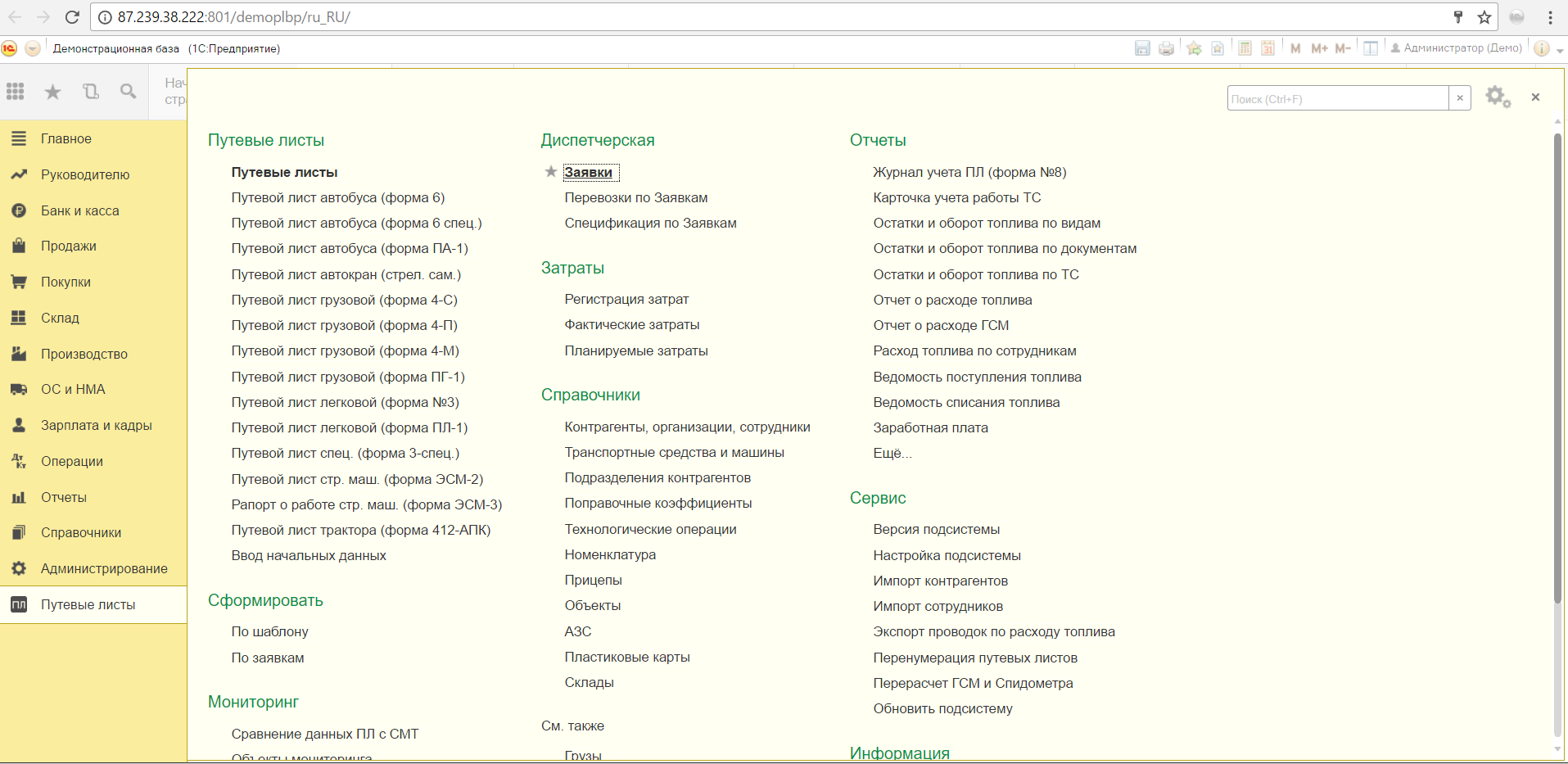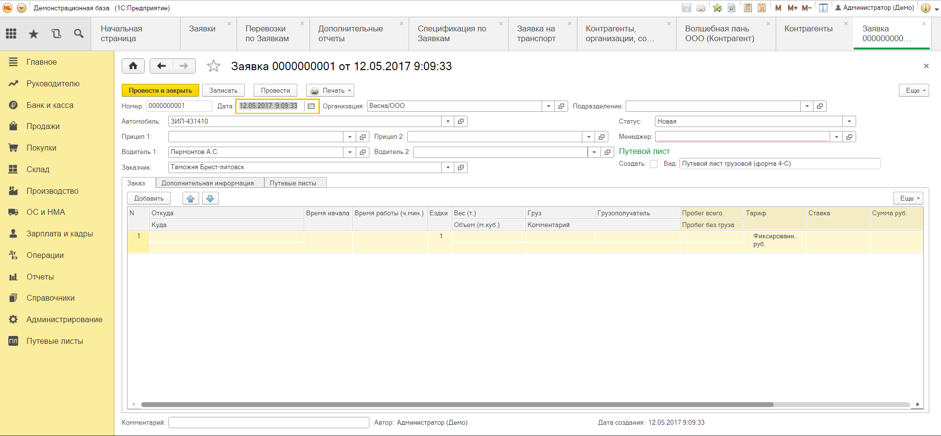 Изменение заявки в подсистеме Путевые листы для 1С от ПОБЕДАСОФТ