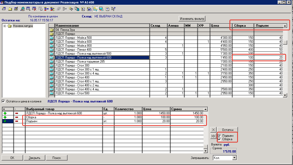 1. Привязать к каждому товару в номенклатуре свою ЦЕНУ услуг Сборки и Подъема.
