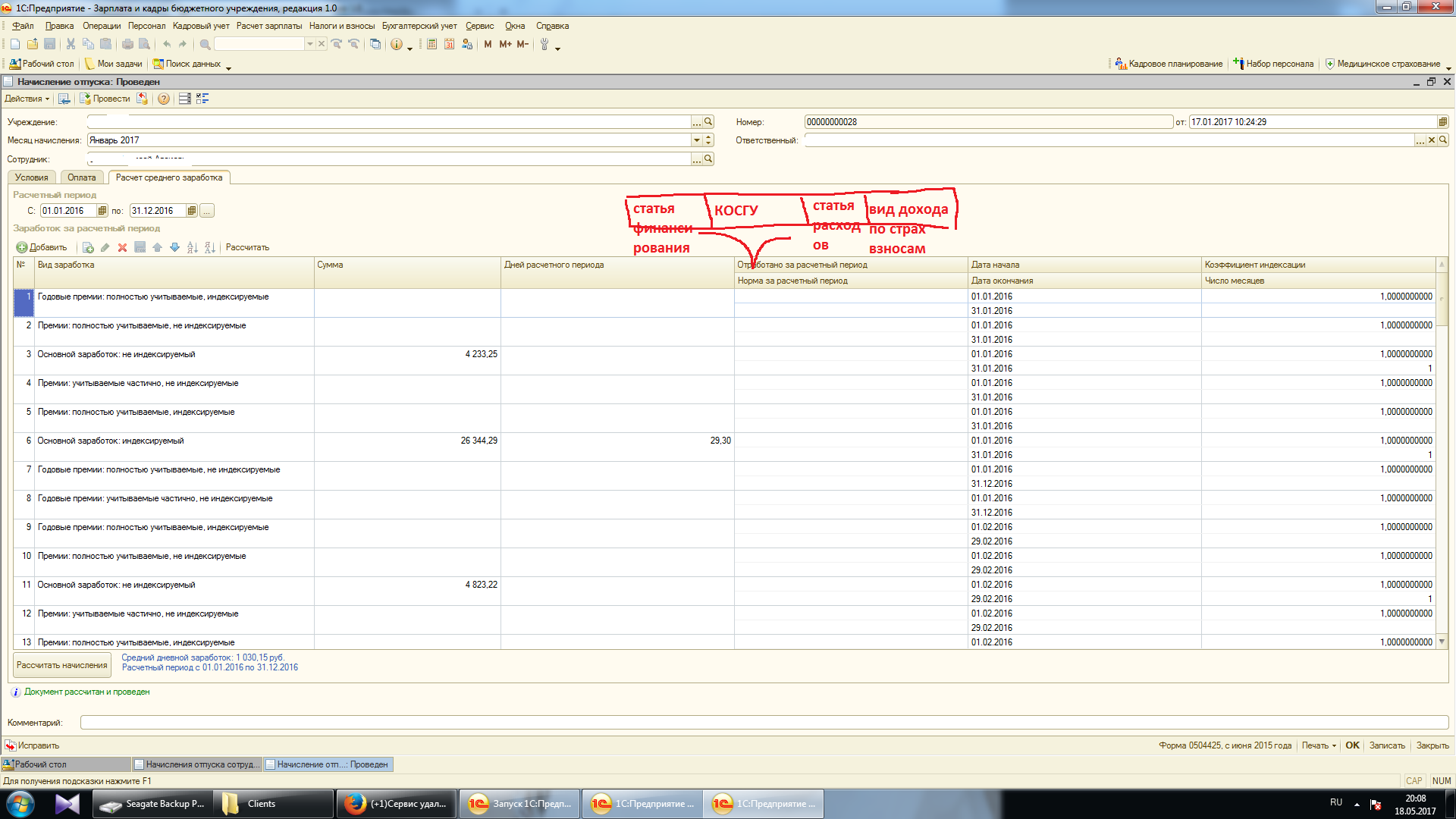 В ЗикБУ ред 1.0 надо доработать механизм распределения по источникам финансирования начисления отпускных (командировок). В базе нет предыдущего года для формирования среднего заработка, поэтому недостающие периоды расчетчик будет вносить вручную, а чтобы эти суммы распределились по источникам финансирования нужно доработать табличную часть "Расчет среднего заработка" в этих документах (см. скрин). При распределении начисленной суммы отпускных (командировочных) по источникам финансирования те месяца, у которых заполнены добавленные колонки должны разбиваться пропорционально этих сумм, а если колонки не заполнены, то работает штатный механизм
