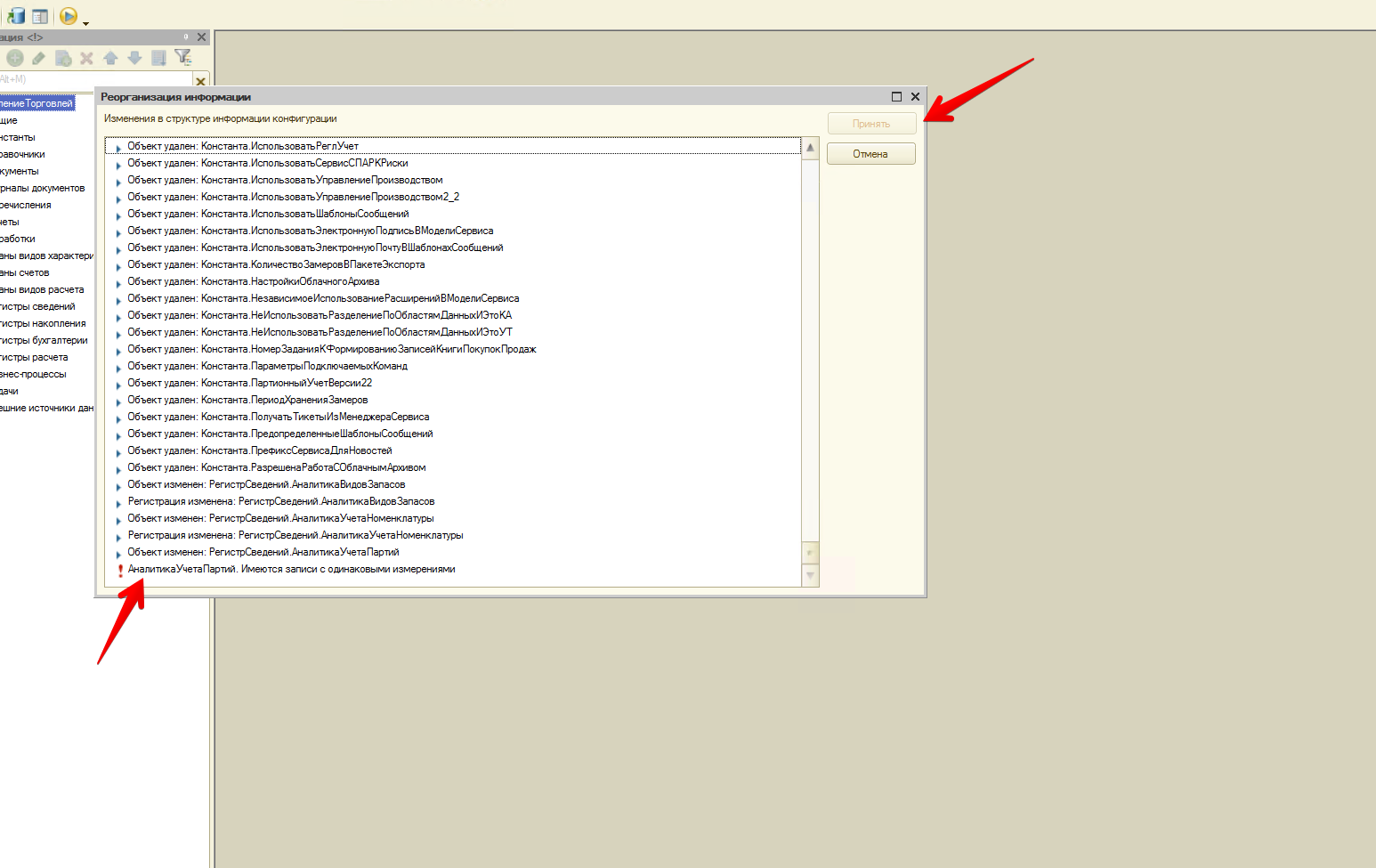 Требуется завершить обновление конфигурации, устранить ошибку на скрине. (дубли Аналитики учета партии)