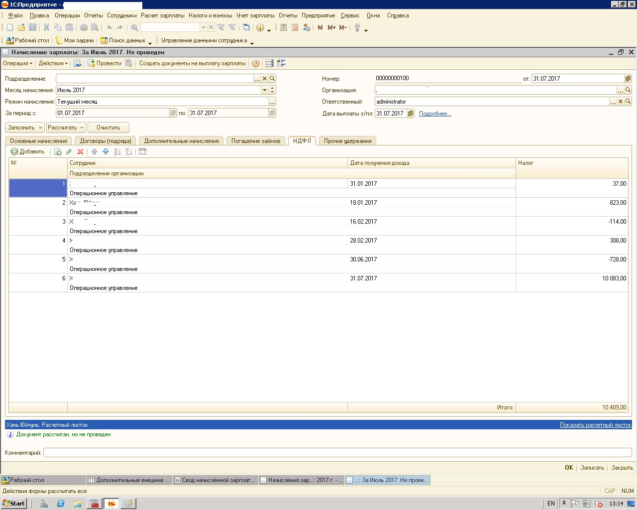 У сотрудника при начислении зарплаты за июль появляются записи по коррекции НДФЛ за предыдущие месяцы (скриншот).