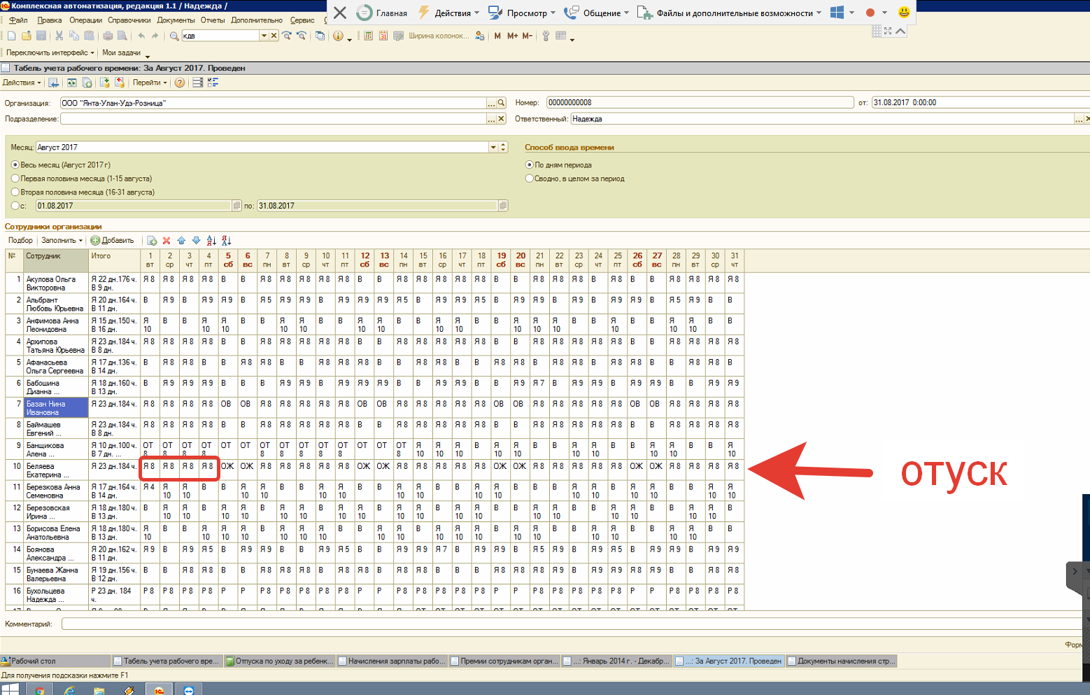 В КА 1.1 не верно заполняется табель , находящиеся в декрете сотрудницы проставляет рабочии дни , а выходные проставляет как отпуск