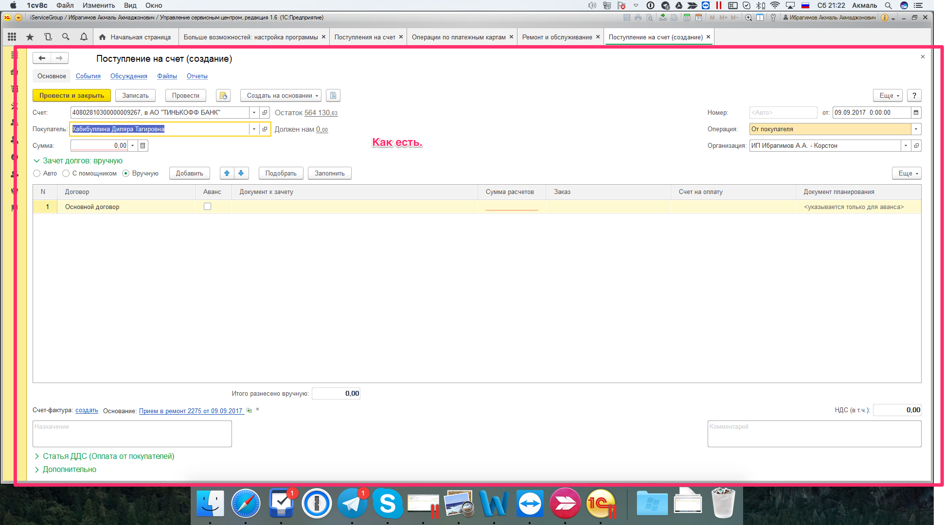 Добавить оплатой картой с кнопки "Поступление на счет" УНФ УСЦ.
