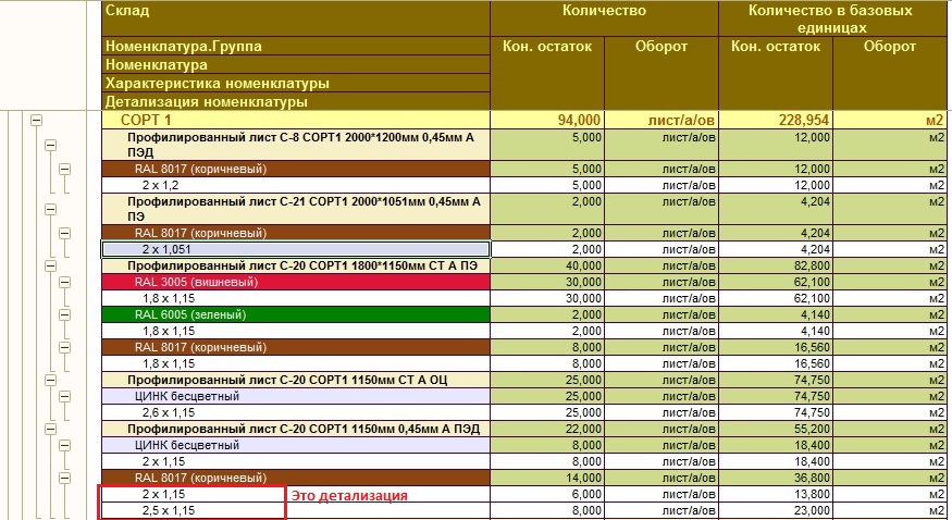 Нужно сделать Отчет на основе или по аналогии с "Анализ доступности товаров на складах", который будет отображать данные и по ТМЦ с ед. измерения в штуках и по ТМЦ, у которых есть дополнительная детализация по длине, ширине, количеству.