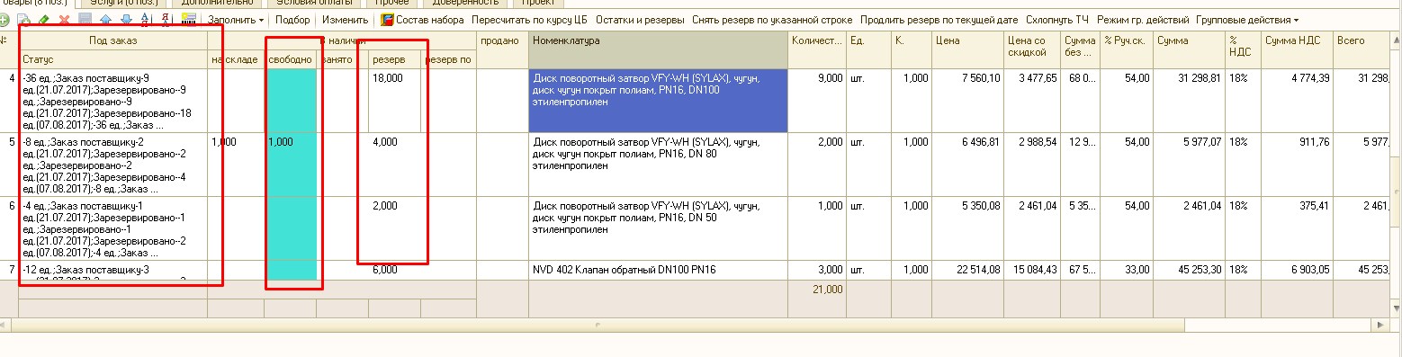 В документе счет некорректно отображается зарезервированное количество товара, свободное количество и статус.