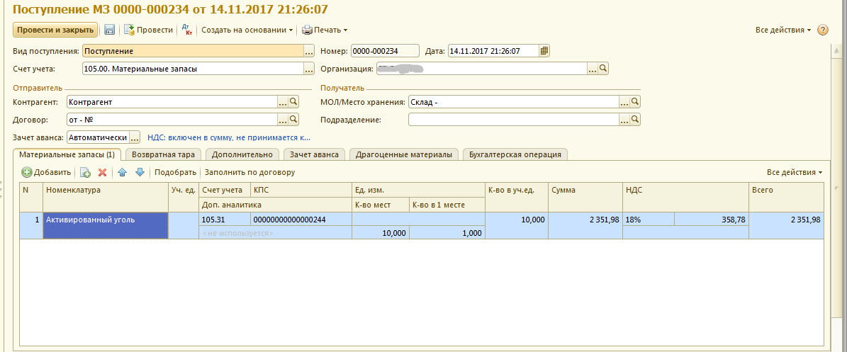 Поступили медикаменты в количестве 10 штук на сумму 2351,98 т.е 2351,98/10 = 235,198 за штуку (скрин_1)