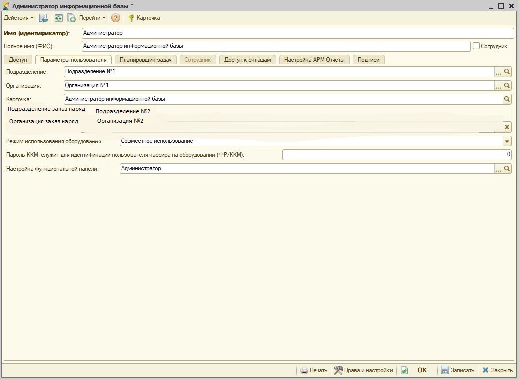 нужно создать в карточке пользователя 2 дополнительных права, которые будут отвечать за значение организации и подразделение ТОЛЬКО в заказ наряде. Так же необходимо, что бы сохранилась корректность работы действия "Ввод на основании"