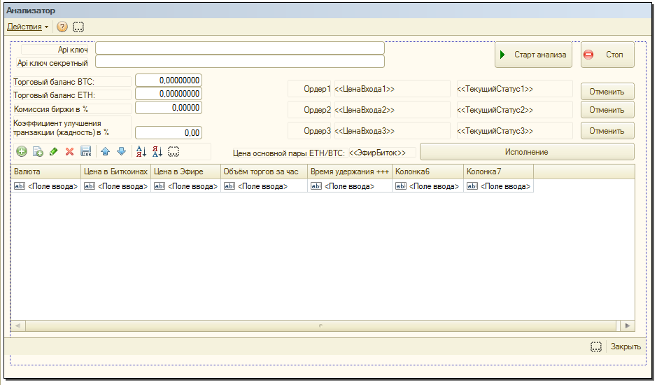 Требуется обработка для работы с криптовалютной биржей, в частности загрузка текущих котировок в таблицу значений для последующего анализа (сам анализ не требуется, будет делаться дополнительно). В обработке должны быть функции для работы с приказами постановка по цене и количеству, статус приказа, отмена приказа. Вывод баланса в эфире или биткоине.