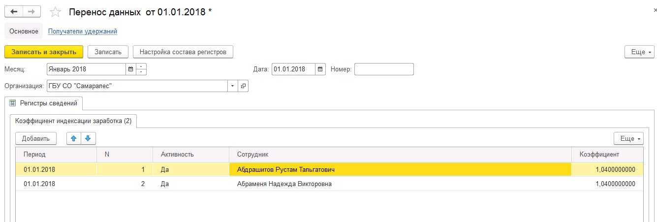 И регистр должен заполниться строками - по каждому сотруднику - сотрудник, № - порядковый номер, Активность = Да, сотрудник , коэф индексации 1,04.