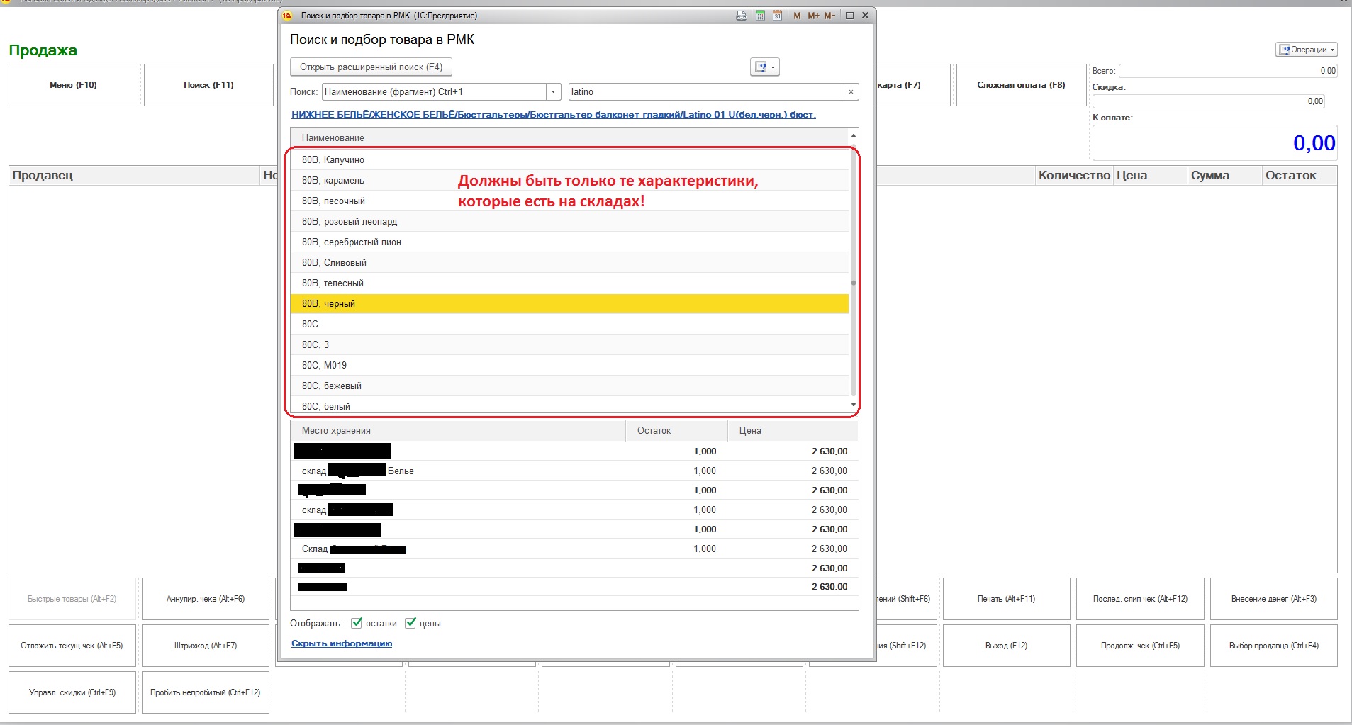 В конфигурации Розница, редакция 2.2 (2.2.7.37) в РМК при подборе поиском в окне выбора характеристики должны быть только те, что есть на остатках. Осуществить это нужно расширением. (.cfe)