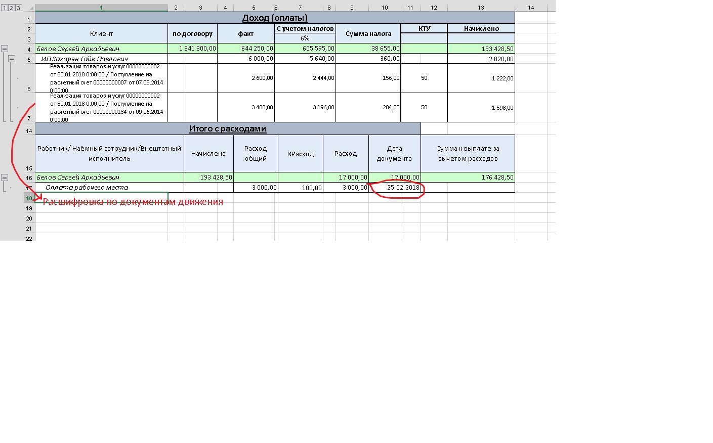 Есть внешний отчёт (вид в прикреплёнке), по реализациям есть расшифровка по документам. Нужно добавить такую-же для документов расхода. + вывод даты напротив каждого расхода. База изменена, исполнителю предоставлю доступ.